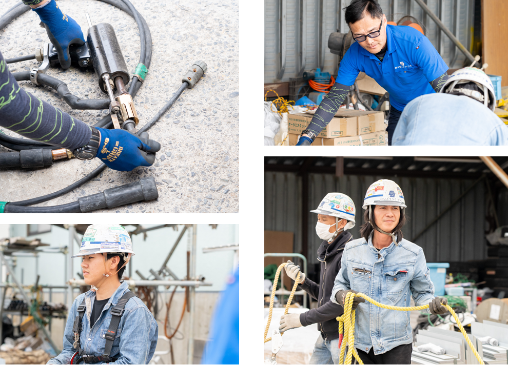 基本的な流れとして、朝会社に集まり3人1 組で現場に向かいます。朝礼ミーティング終了後、持ち場工具の点検を行った後に、材料間配り、溶接、溶断など、一人一人が役割分担をこなし、最後に養生片付け確認を行い安全運転で帰社するまでが主な流れです。